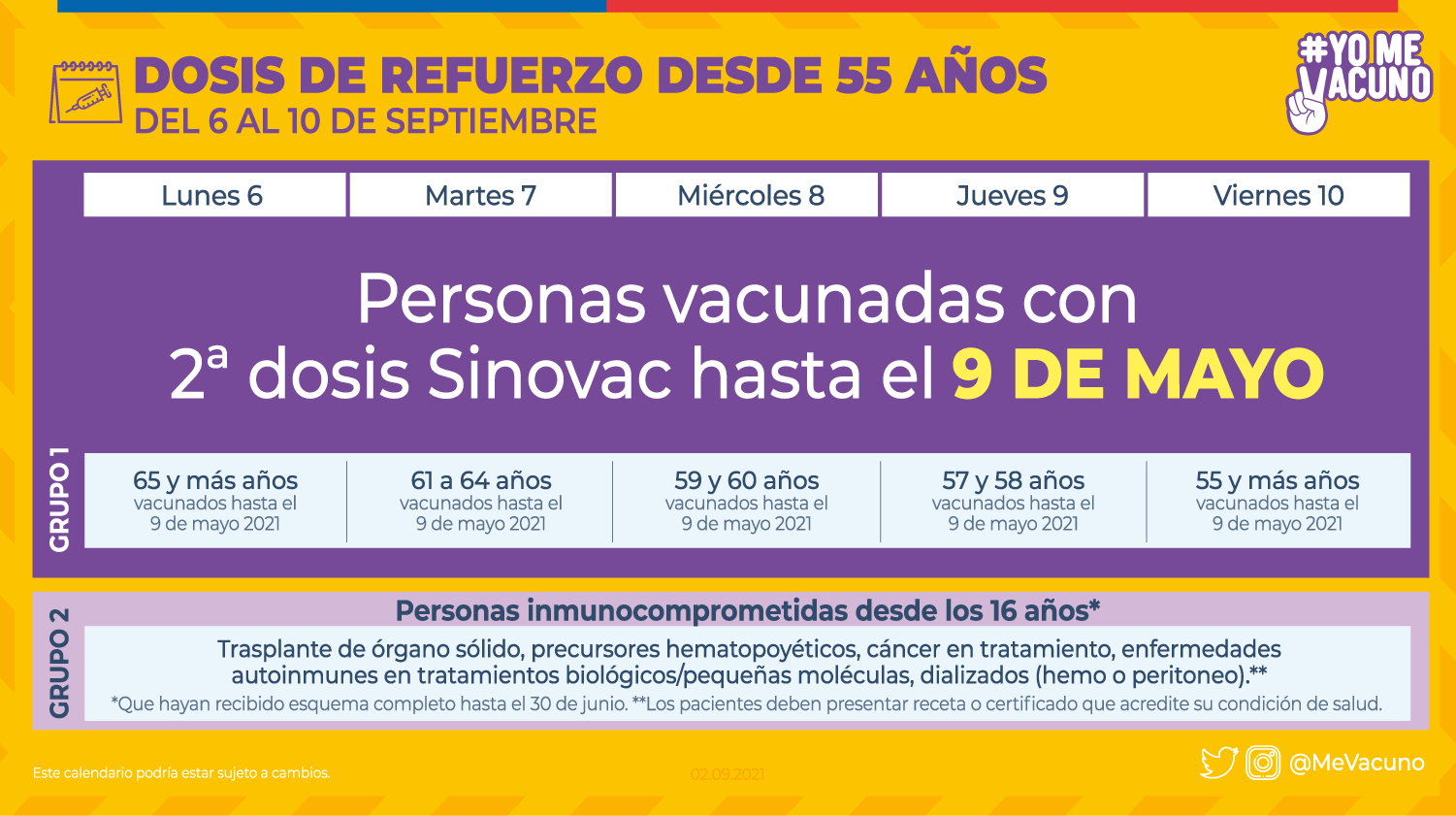 Respecto a esto, te contamos que en el caso de los mayores de 55 años, corresponde a personas que recibieron la segunda dosis hasta el 09 de mayo de este año.