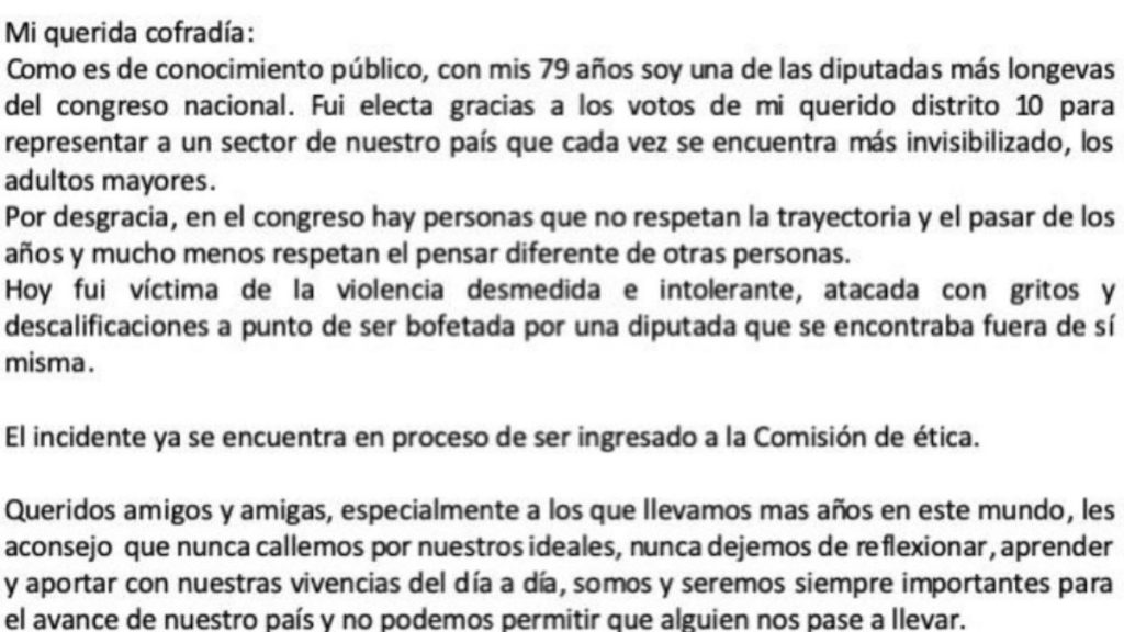 Pero la discusión no quedó ahí, ya que la parlamentaria María Luisa Cordero compartió un comunicado por Twitter, en el que escribió, “como es de conocimiento público, con mis 79 años soy una de las diputadas más longevas del Congreso Nacional”.