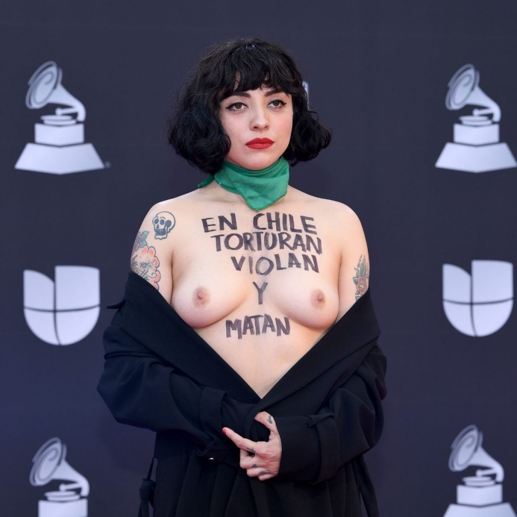 La cantante llegó hasta la alfombra roja de los Premios Grammy Latinos usando un vestido negro, el que más tarde dejó al descubierto su pecho para mostrar el mensaje escrito sobre su piel "En Chile torturan, matan y violan”. Y sobre su cuello, un pañuelo verde a favor de la legalización del aborto.