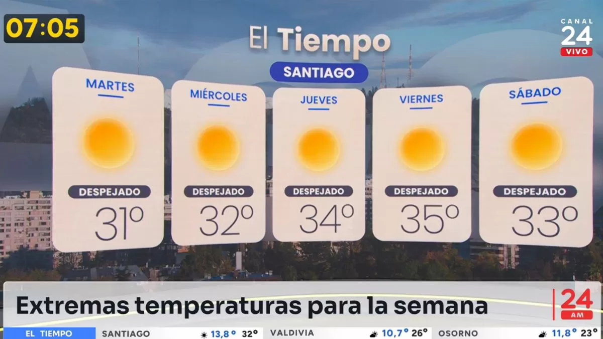 A continuación, te damos la temperatura que tendrá Santiago cada día según Iván: martes 16 (31°), miércoles 17 (32°), jueves 18 (34°), viernes 19 (35°) y sábado 20 (33°).