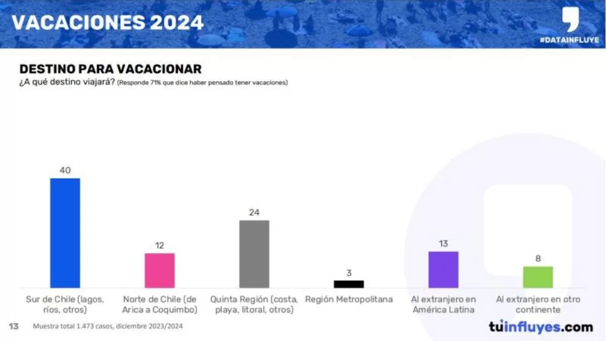 Así lo reveló la encuesta Data Influye a finales de diciembre, donde se reveló que hay una clara preferencia sobre el destino favorito para vacaciones: el 40% opta por el sur de Chile. Mientras que un 24% por el litoral de la Quinta Región y un 21% se inclina por viajar fuera del país.
