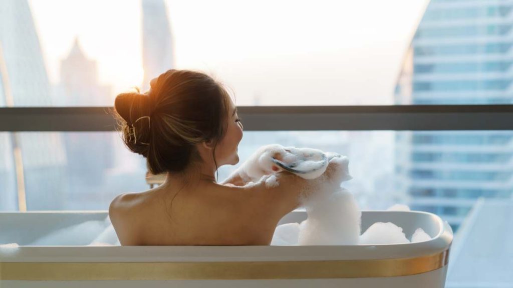 - En la ducha, aprovecha de tener un momento especial con tu cuerpo esparciendo el jabón de forma lenta por toda tu piel. Enfócate en lo que vas sintiendo, disfruta del olor y dedícale un momento especial a cada parte donde vayas tocando. Puedes hacer lo mismo cuando te eches crema.
