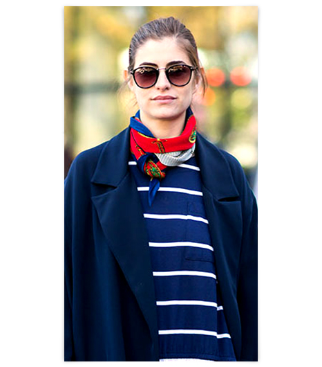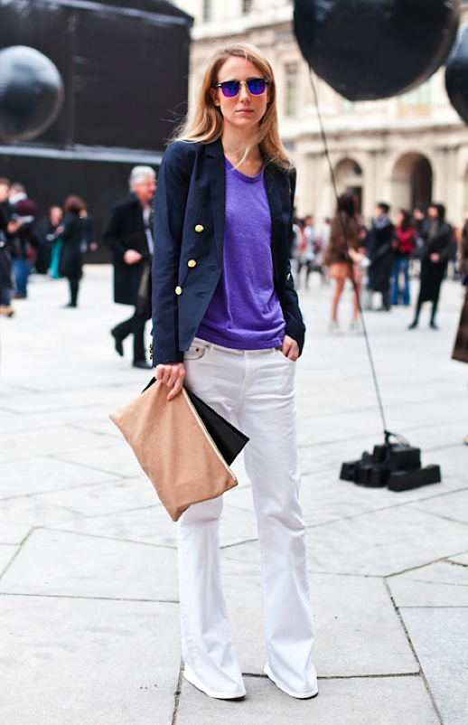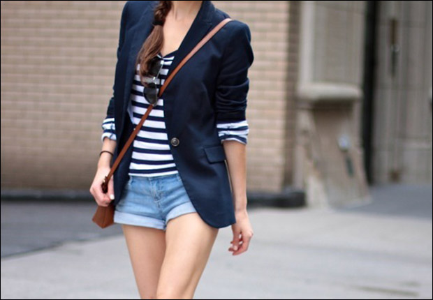 - La tendencia navy o marinera, por medio del clásico top a rayas o el blazer tailored, con los botones dorados a doble fila. Acá el juego va en dos puntos: en la parte de abajo, que va desde el pantalón formal al jeans pata de elefante, pasando por las faldas monocolor; el segundo foco de personalización es el color. Reemplaza la compañía de las dos prendas navy por el color que quieras, como pantalones rojos o una falda verde sin estampado.