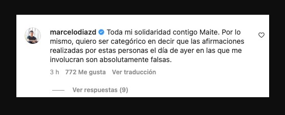 Fue precisamente esa publicación de Instagram a la que se sumó Marcelo Díaz, a través de la caja de comentarios de Maite Orsini. Allí, desmintió los dichos de la transmisión en vivo y manifestó su apoyo a la diputada: