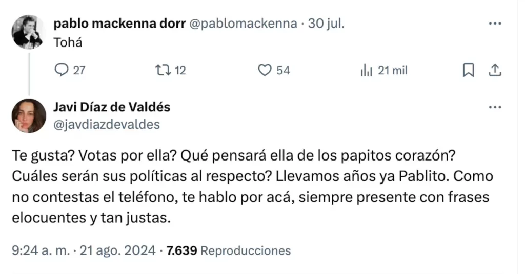 Se trata de una publicación antigua de Mackenna, quién escribió en julio pasado "Tohá", sin mayor contexto en la aplicación. Justamente de este posteo, Díaz de Valdés se colgó para recordarle sus obligaciones como padre al escritor.