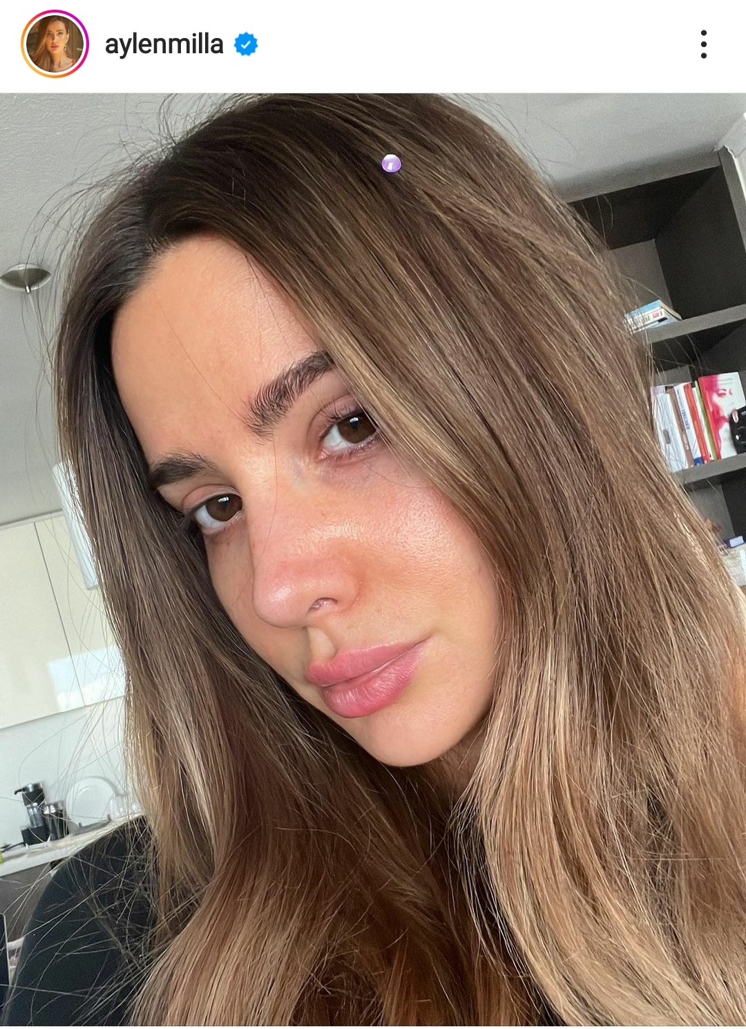 "Con mi brillo violeta, voy a transmutar. Domingo al natural probando mi bling bling. Sin Make up, lo que hay", escribió Aylén Milla junto a la foto en la que aparece sin maquillaje.