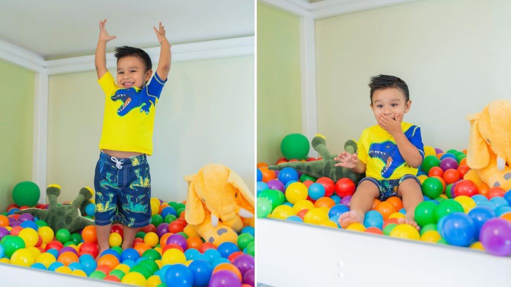 En las 5 imágenes que subió la modelo, se ve al pequeño Noah en medio de una piscina de pelotas, acompañado de sus peluches.