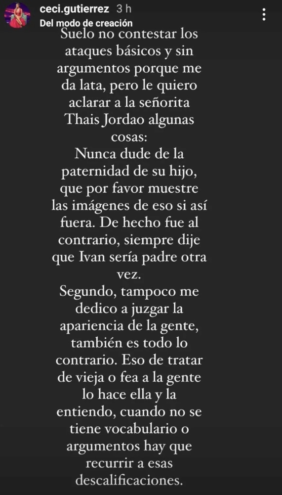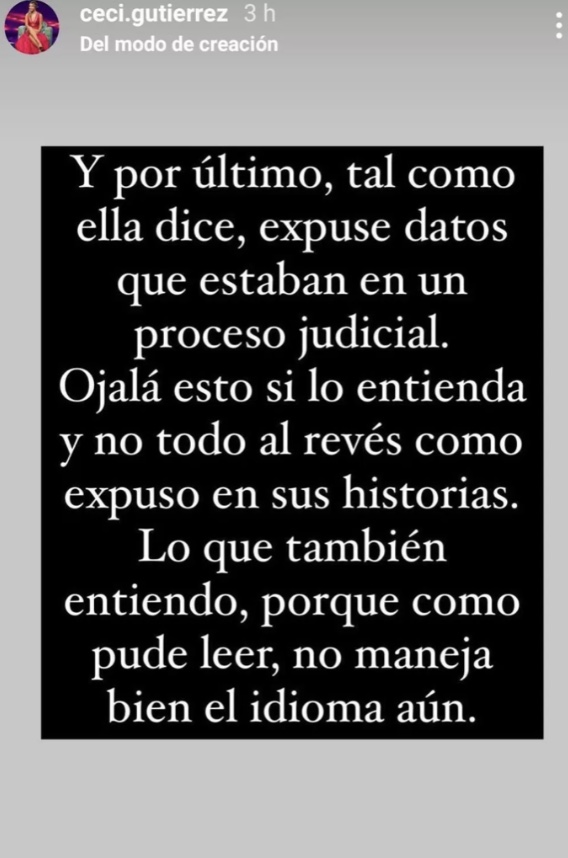 Horas después, la aludida, Cecilia Gutiérrez, compartió un mensaje en sus historias de Instagram para responderle a la pareja de Iván Núñez.
