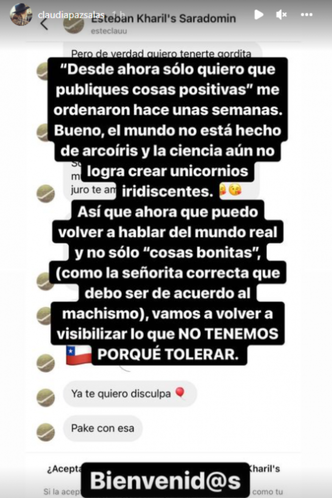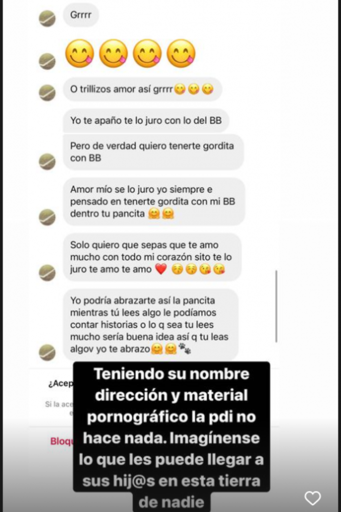 Así Claudia Salas se atrevió a mostrar una conversación con su acosador diciendo "teniendo su nombre, dirección y material pornográfico, la PDI no hace nada. Imagínense lo que les puede llegar hacer a sus hij@s en esta tierra de nadie".