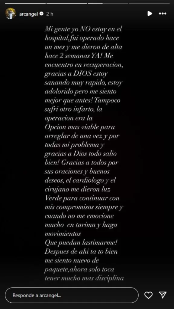 Por su parte, Arcángel compartió en sus historias un nuevo desahogo donde aclaró que actualmente no se encuentra en la clínica, que le dieron el alta y que se está recuperando rápidamente.