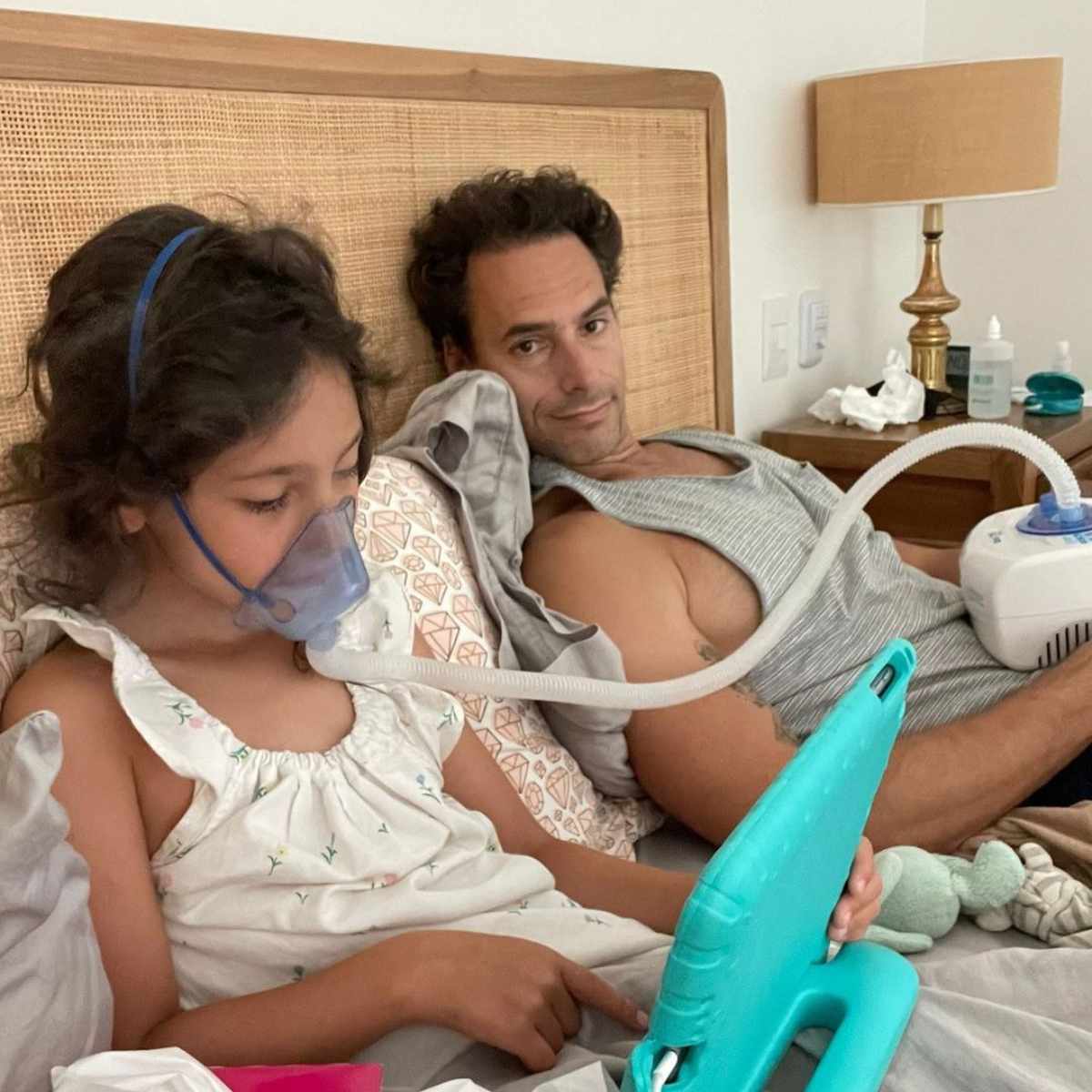 En una de las imágenes se puede ver a la hija de la actriz acostada en la cama ocupando un nebulizador, mientras Lucas la acompaña. Y en otra de las postales aparece con la pequeña durmiendo.