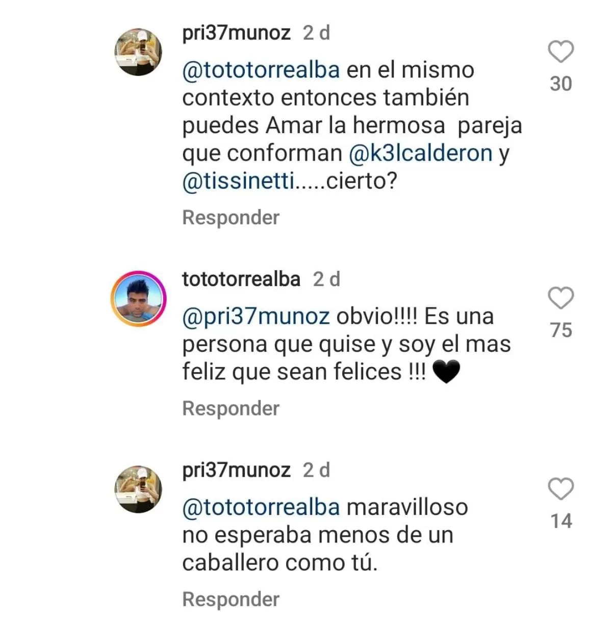 "En el mismo contexto entonces también puedes amar la hermosa pareja que conforman @k3lcalderon y @tissinetti... cierto?", le consultaron a Toto Torrealba, por lo que dio su honesta opinión sobre el romance de Kel Calderón.