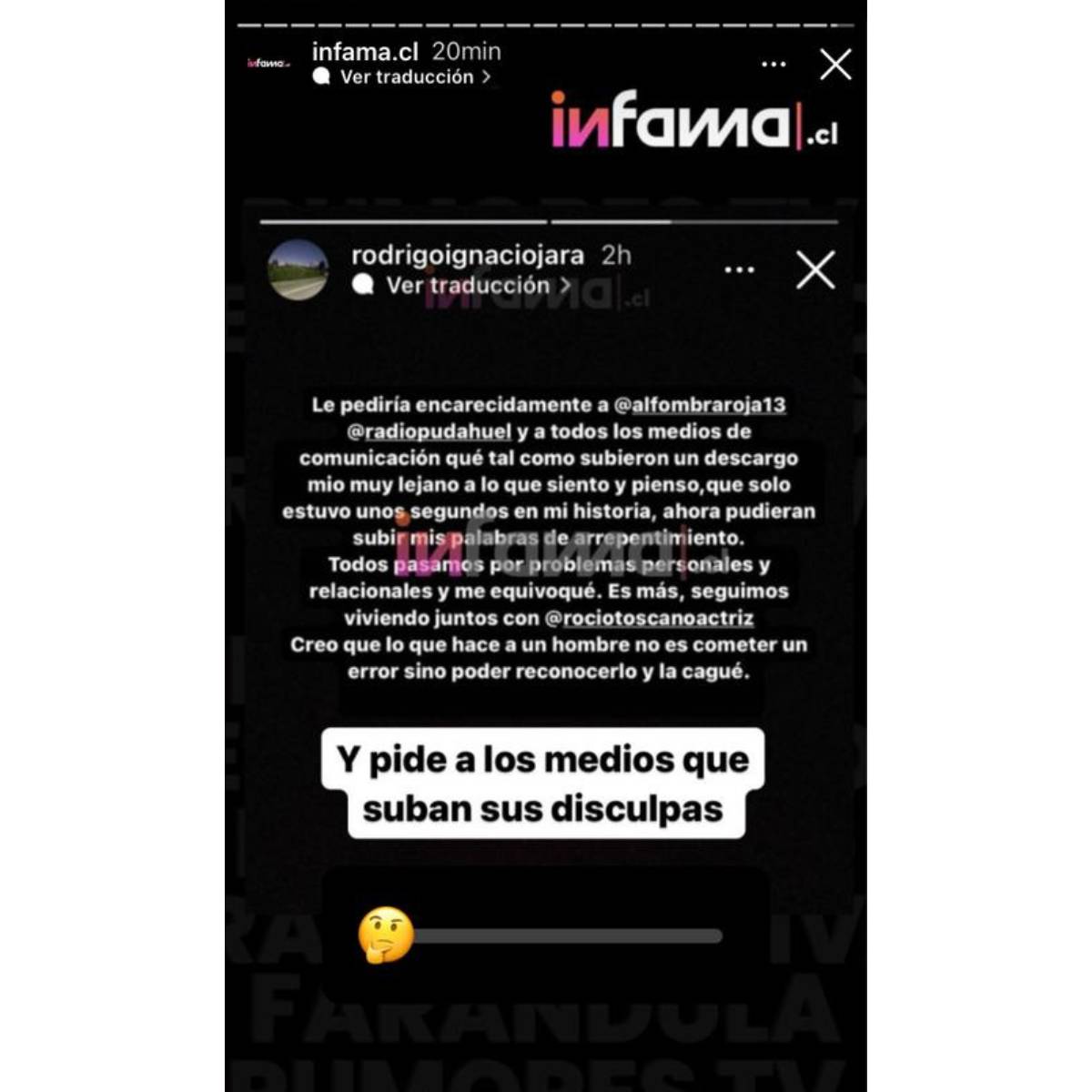 Pero luego de sus impactantes declaraciones, Rodrigo Jara explicó que cometió un error, contando que realmente "no es lo que pienso ni lo que siento, estoy pasando por un mal momento personal y es humano caga...".