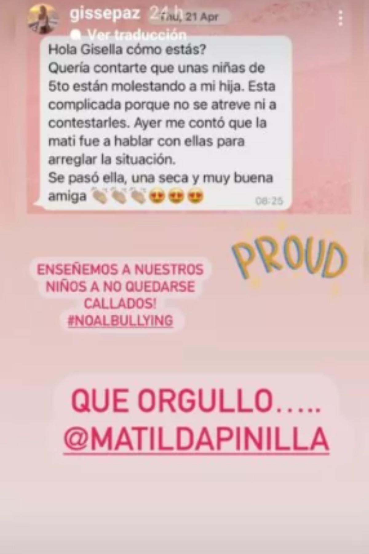 Y es que en sus historias de Instagram, donde suma más de 300 mil seguidores, contó que su retoña de 11 años defendió a una compañera que sufría de bullying.