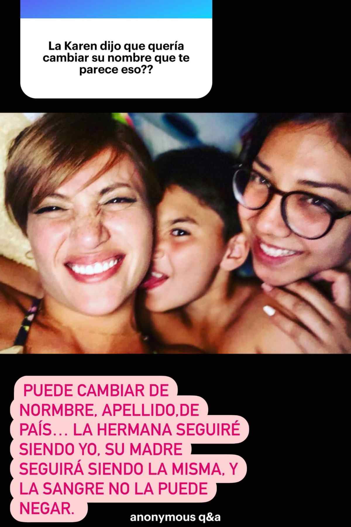 Además, se refirió al posible cambio de nombre de Karen Bejarano. "Puede cambiar de nombre, apellido, país... La hermana seguiré siendo yo, su madre seguirá siendo la misma, y la sangre no se puede negar", lanzó.