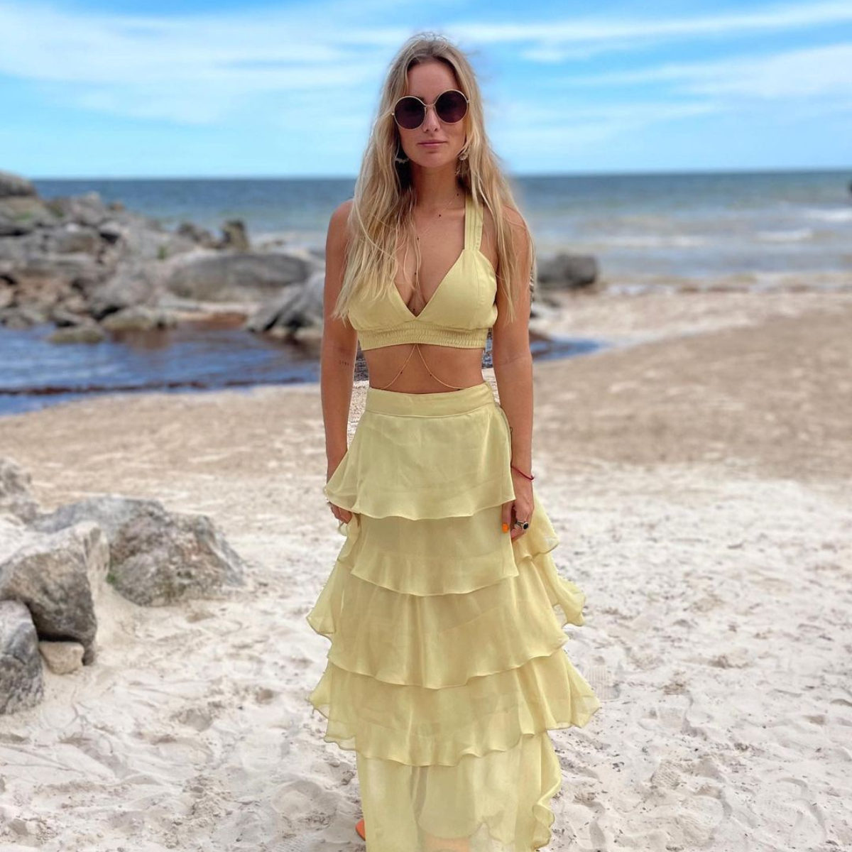 A través de sus redes sociales, la influencer compartió bellas postales a la orilla del mar. En las fotografías la podemos ver luciendo un conjunto amarillo pastel con una falda larga con vuelos y un top.