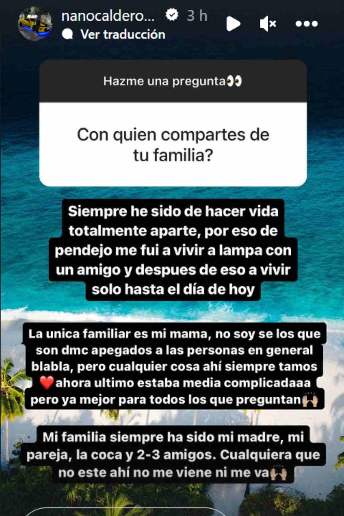 El tema salió cuando el joven en su cuenta de Instagram @nanocalderon97 hizo una dinámica de preguntas y respuestas, situación que uno de sus seguidores aprovechó para saber con qué integrante de su familia es cercano.