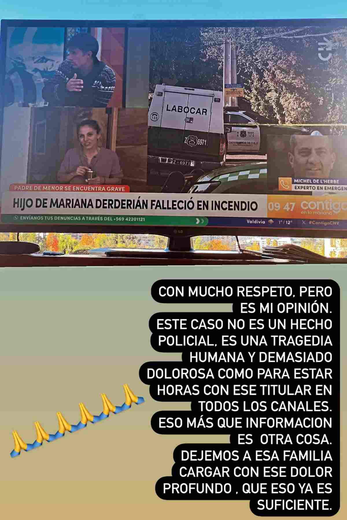 Junto a este mensaje compartió una fotografía de su tele mientras veía Chilevisión, destacando el titular que decía: "Hijo de Mariana falleció en incendio".