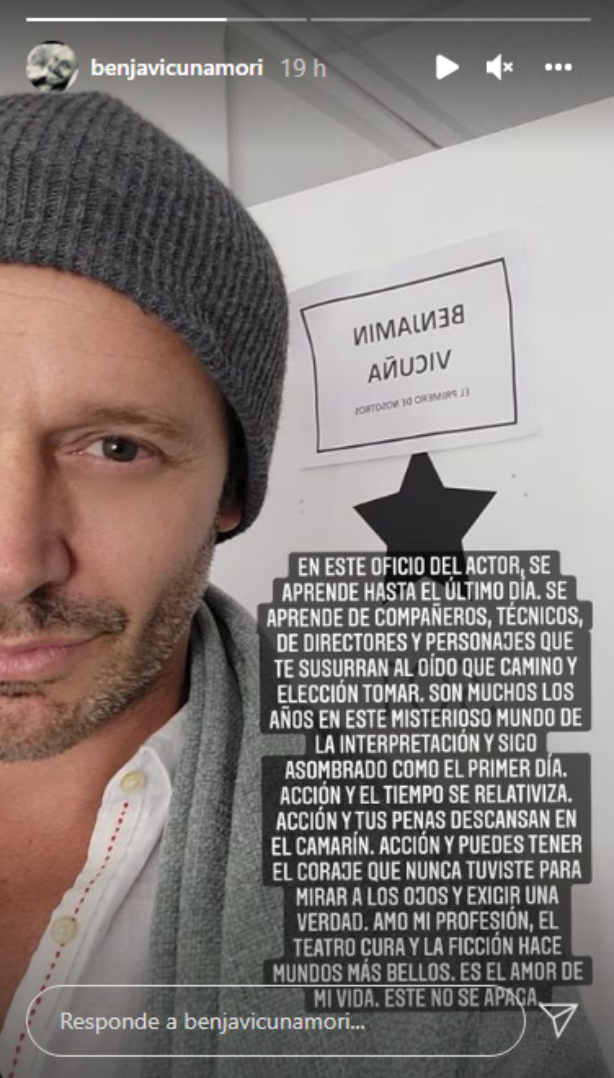 "En este oficio del actor, se aprende hasta el último día. Se aprende de compañeros, técnicos, de directores y personajes que te susurran al oído que camino y elección tomar", comenzó escribiendo Benjamín Vicuña en su reflexión.