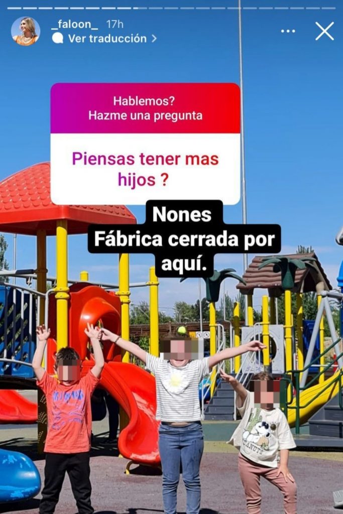 “¿Piensas tener más hijos?”, le preguntó un seguidor. A lo que la modelo respondió un tajante "Nones”, mostrando una foto de sus tres hijos y la frase, “Fábrica cerrada por aquí”, dejando claro el deseo de Faloon Larraguibel de no tener más hijos.