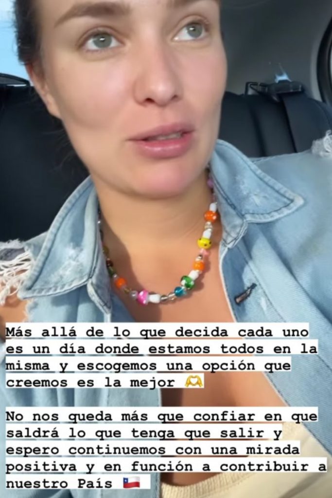 Por su parte, la actriz Kika Silva compartió un mensaje más largo en su historia de Instagram. "Más allá de lo que decida cada uno, es un día donde estamos todos en la misma y escogemos una opción que creemos la mejor. No nos queda más que confiar en que saldrá lo que tenga que salir y espero que continuemos con una mirada positiva y en función de contribuir a nuestro país", dijo en un video.