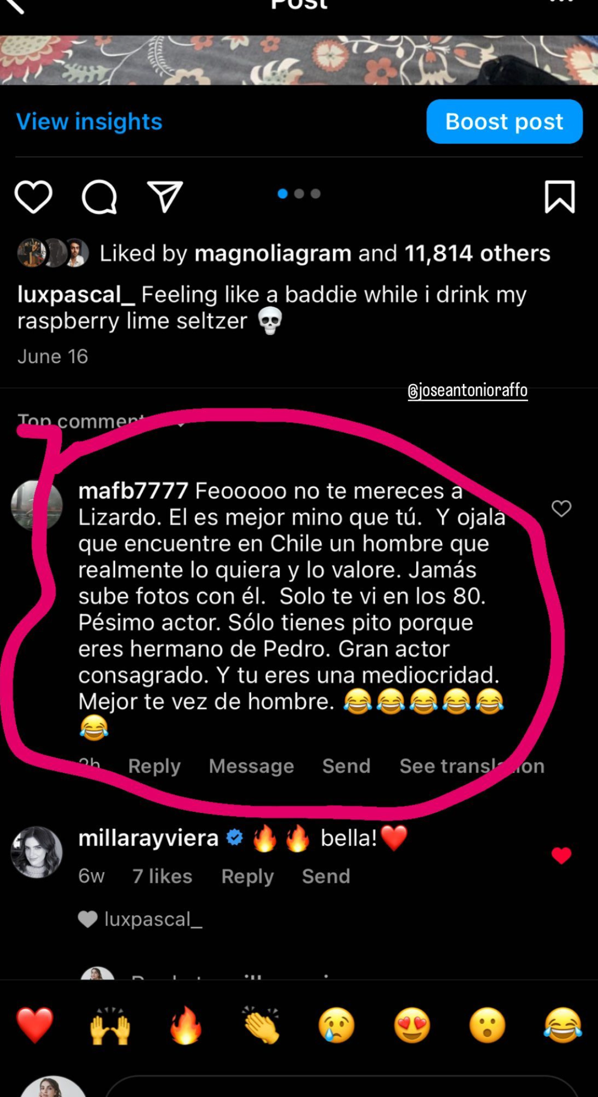 Y es que, a través de sus historias de Instagram, Lux Pascal mostró los dichos de la mujer, quien empezó refiriéndose al vínculo amoroso de Lux con el actor José Antonio Raffo. Esto para luego hablar sobre su parentesco con Pedro Pascal.