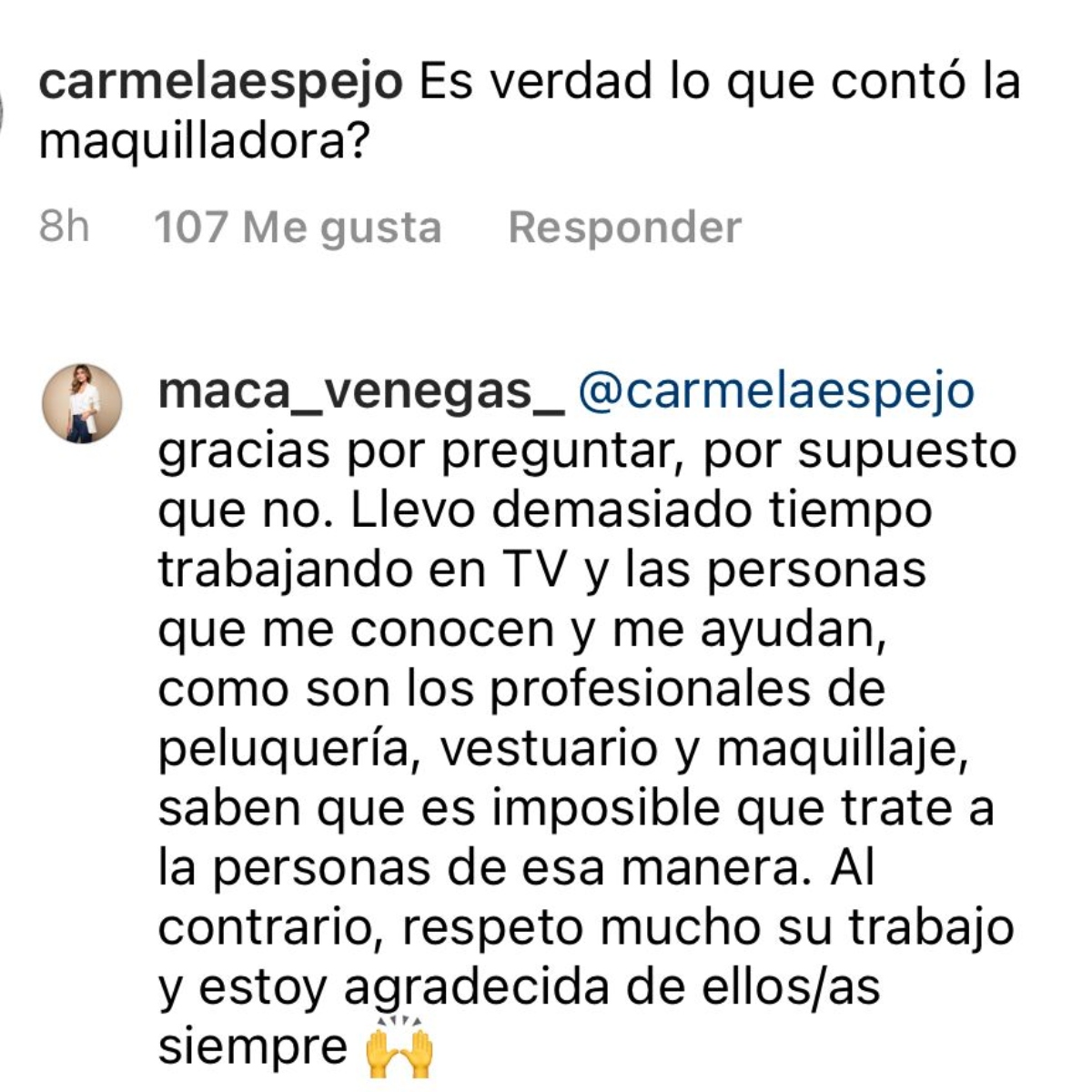Luego de que se diera a conocer lo que vivió la maquilladora, Macarena Venegas recibió varios comentarios en su cuenta de Instagram, donde un internauta le preguntó si era verdad lo que pasó.