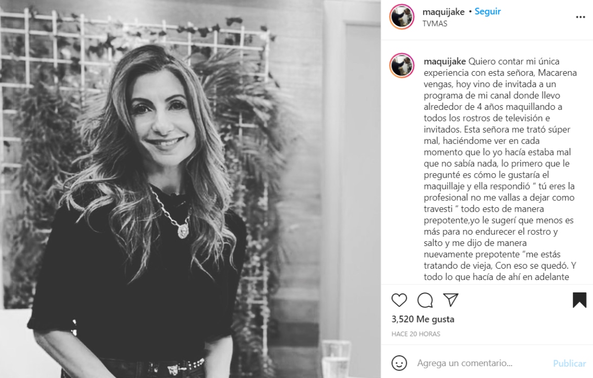 «Quiero contar mi única experiencia con esta señora, Macarena vengas, hoy vino de invitada a un programa de mi canal donde llevo alrededor de 4 años maquillando a todos los rostros de televisión e invitados. Esta señora me trató súper mal», partió diciendo la maquilladora.