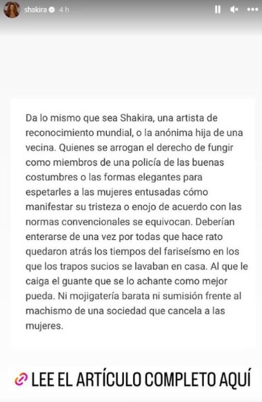"Da lo mismo que sea Shakira, una artista de reconocimiento mundial, o la anónima hija de una vecina. Quienes se arrogan el derecho de fungir, como miembros de una policía de las buenas costumbres o las formas elegantes, para espetarles a las mujeres entusadas cómo manifestar su tristeza o enojo de acuerdo con las normas convencionales se equivocan. Al que le caiga el guante que se lo achante como mejor pueda. Ni mojigatería barata ni sumisión frente al machismo de una sociedad que cancela a las mujeres", dice parte del texto.