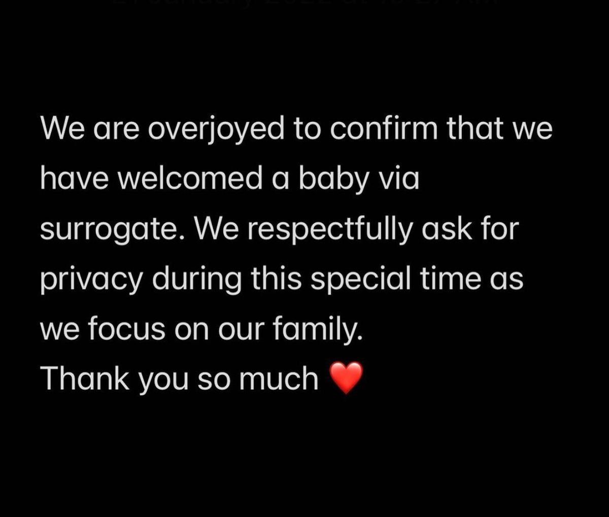 Luego tuvo una petición especial: "Pedimos respetuosamente privacidad durante este momento especial mientras nos enfocamos en nuestra familia", añadió en la publicación.