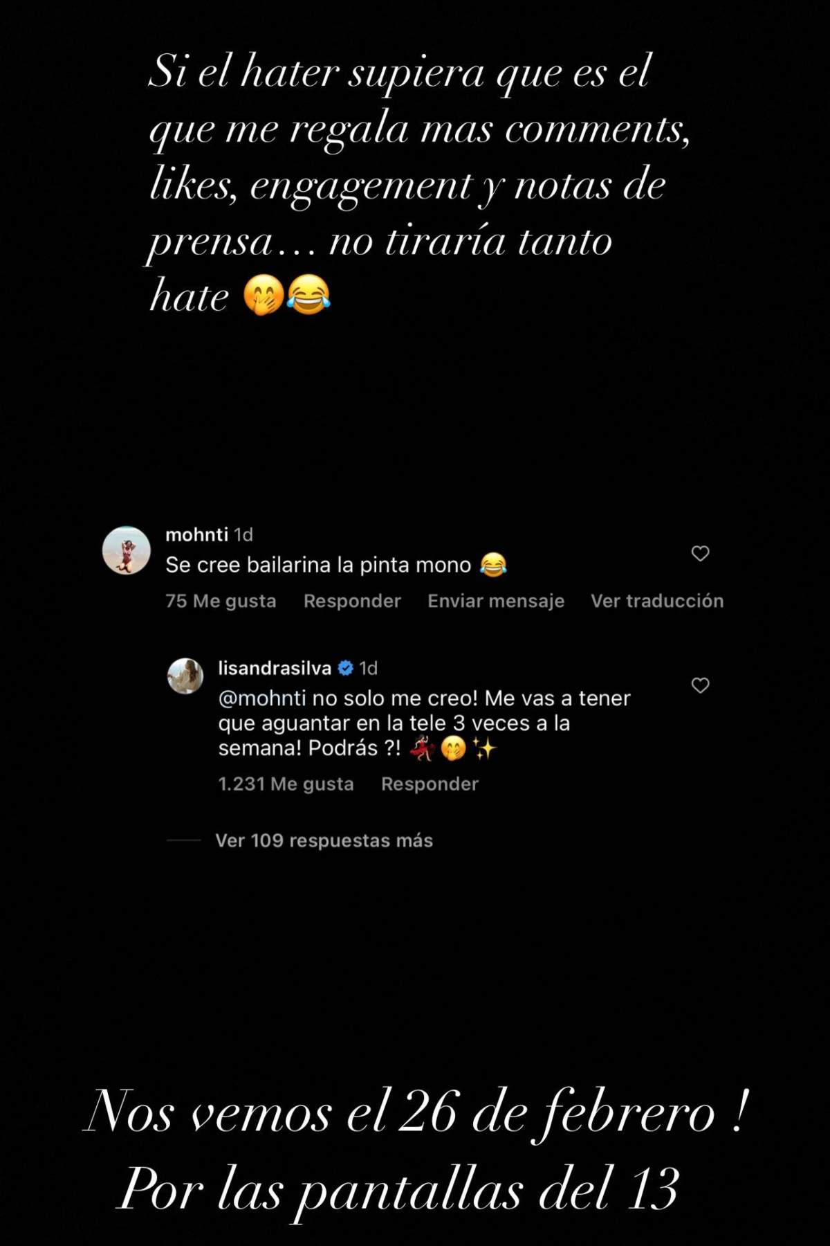 "No solo me creo! Me vas a tener que aguantar en la tele 3 veces a la semana! Podrás?!", fue la aplaudida respuesta de Lisandra Silva, para luego asegurar que gracias a los haters recibe mayor atención.