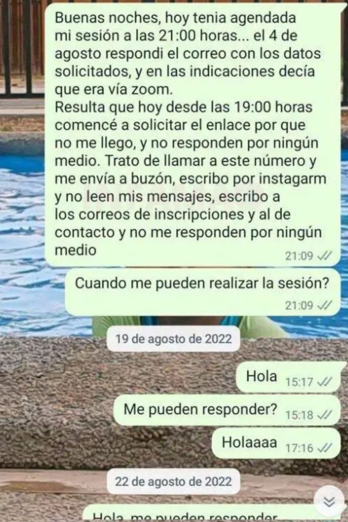 Sin embargo, solo recibió señales de la secretaria de la médium, quien mediante un correo le respondió "que el mensaje dejado en Instagram perjudica la credibilidad de Vanessa y por las malas energías no se iba a realizar la sesión de canalización que había ganado", indicó Infama.