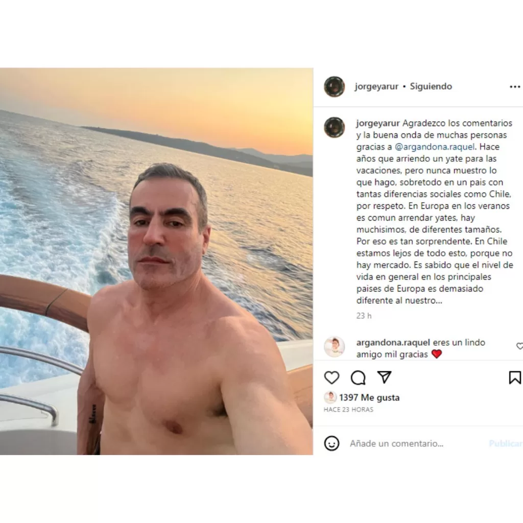"Hace años que arriendo un yate para las vacaciones, pero nunca muestro lo que hago, sobre todo en un país con tantas diferencias sociales como Chile, por respeto", agregó Jorge Yarur.