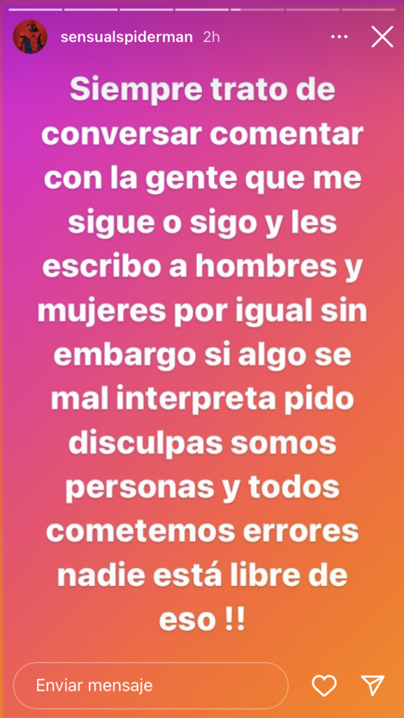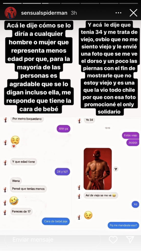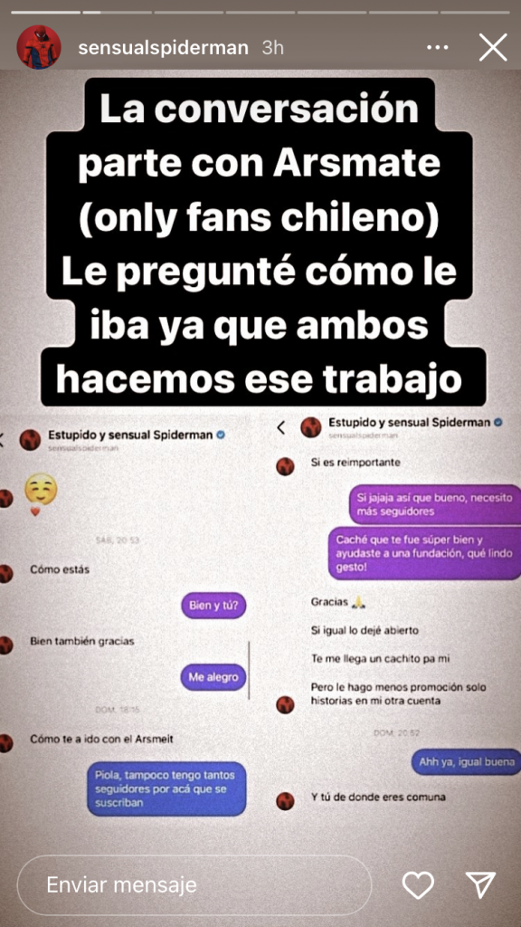 “La conversación parte con Arsmate (OnlyFans chileno). Le pregunté cómo le iba ya que ambos hacemos ese trabajo”, comenzó diciendo Sensual Spiderman en Instagram.