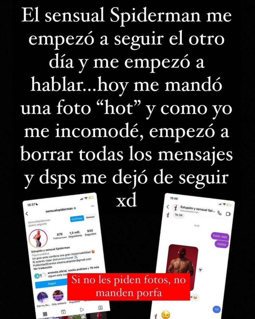 Ella subió pantallazos para respaldarse. Luego aclaró que la foto enviada por Sensual Spiderman no fue explícita. “Yo dije que era ‘hot’ y en mis historias dije que no era explícita, pero no porque no muestre el pene significa que no sea inapropiado. Ojo ahí”, manifestó.