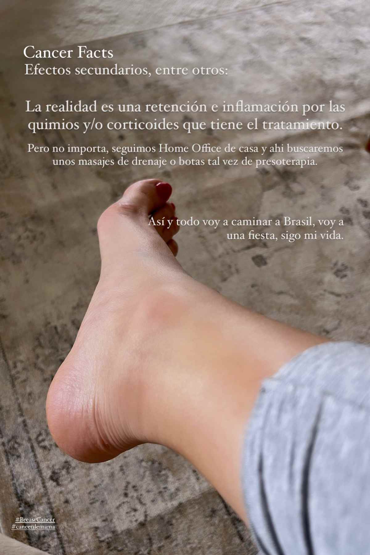 En la imagen, se ve que uno de sus tobillos y su pies están inflamados. "Cancer facts. Efectos secundarios, entre otros: La realidad es una retención e inflamación por las quimios y/o corticoides que tiene el tratamiento", detalló.