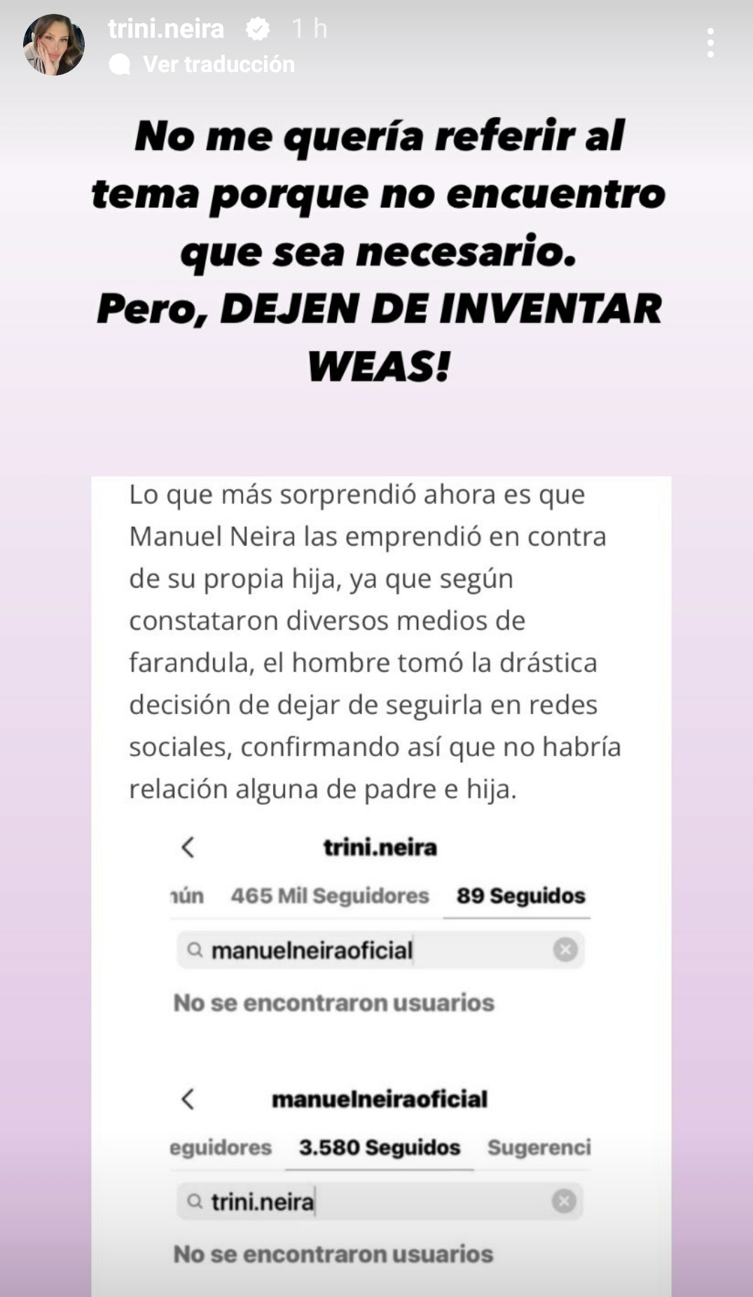 Y tras este episodio, diversos medios señalaron que Manuel Neira había tomado una drástica decisión. Nada menos que dejar de seguir a su hija mayor en redes sociales, lo cual habría desatado un quiebre.