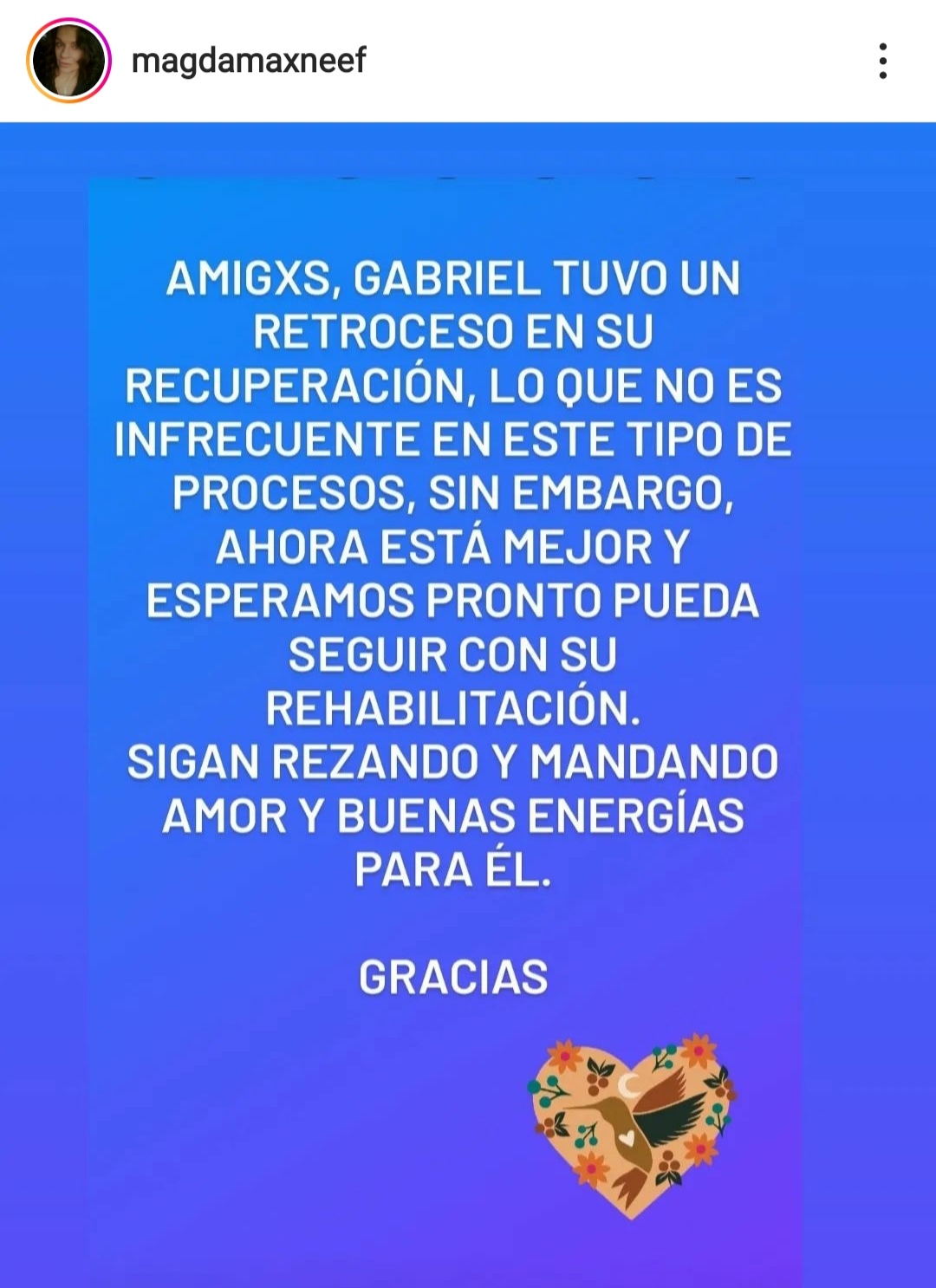 "Gabriel tuvo un retroceso en su recuperación, lo que no es infrecuente en este tipo de procesos. Sin embargo, ahora está mejor y esperamos que pronto pueda seguir con su rehabilitación. Sigan rezando y mandando amor y buenas energías para él, escribió Magdalena Max-Neef.