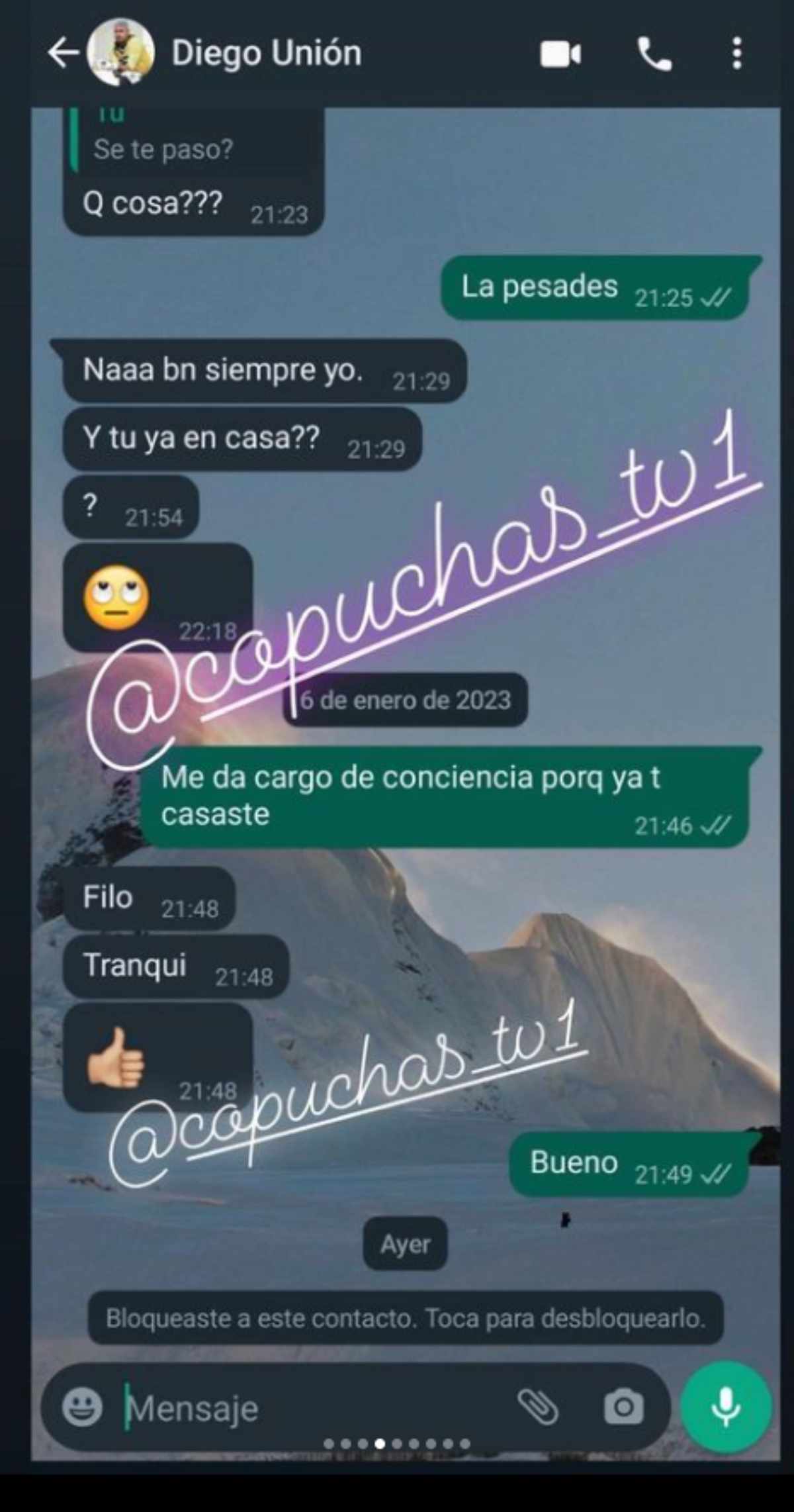 Y en otra de las conversaciones se ve que la reunión entre el pololo de Yamila Reyna con la otra chica nunca se concretó, tal como detalló el portal. ¿La razón? La desconocida no quiso porque el jugador tiene pareja. "Me da cargo de conciencia porque ya te casaste", le señaló ella, a lo que él e respondió que "filo, tranqui". Tras esto, la ella lo bloqueó de WhatsApp.