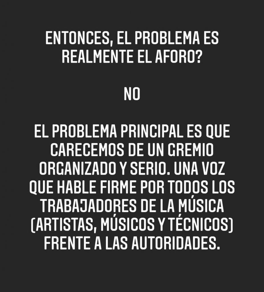 Durante los últimos días, artistas y trabajadores de la música han alzado la voz, reclamando esta situación. El director musical de Paloma Mami, Roberto López, compartió una reflexión en su Instagram @basslopez, haciendo la comparación entre los estadios de fútbol y los conciertos.