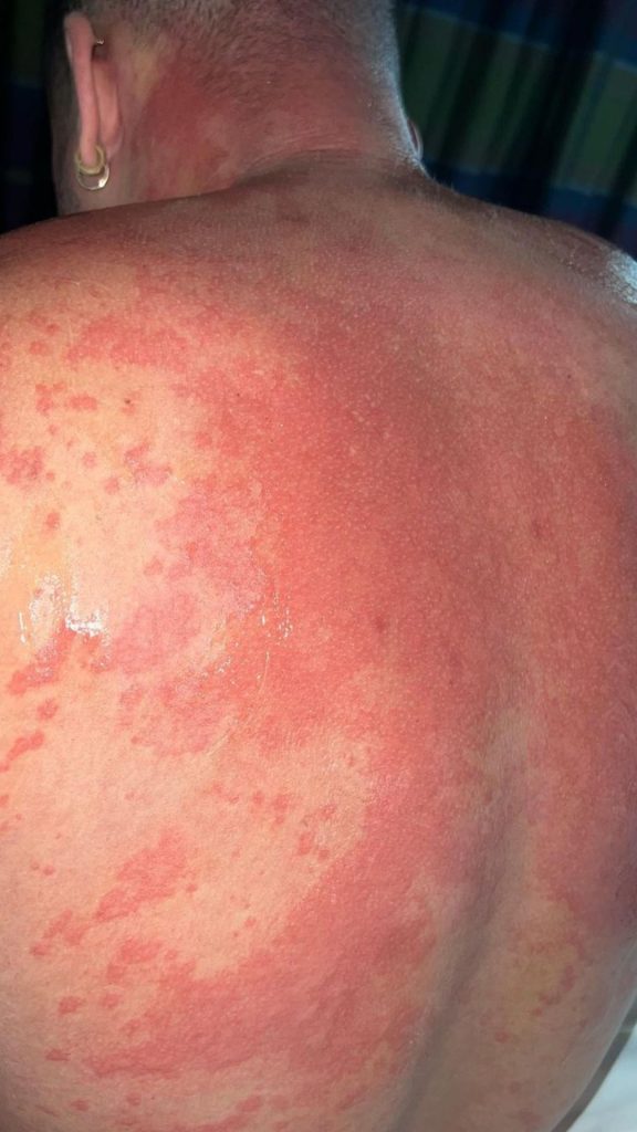 Una de las fotografías que compartió el cantante preocupó a sus fans, ya que sale con una evidente alergia que afectó toda su espalda y nuca, con marcas rojas e inflamadas.