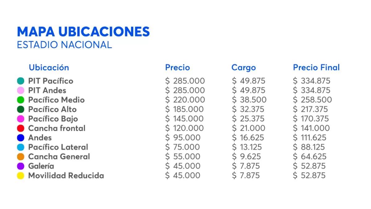 Respecto a los precios, el ticket más barato (Galería) cuesta $52.875 con el cargo por servicio, mientras que el más caro vale $334.875 (PIT Pacífico). A continuación, te dejamos el mapa referencial de ubicaciones y sus respectivos valores: