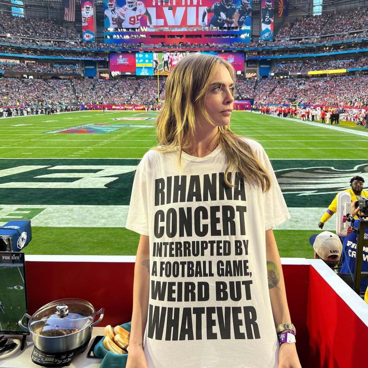 Una de ellas fue Cara Delevine, quien compartió en su cuenta de Instagram una imagen en donde se le puede ver en el estadio con una camiseta que decía "Concierto de Rihanna interrumpido por un partido de futbol, raro, pero da igual".