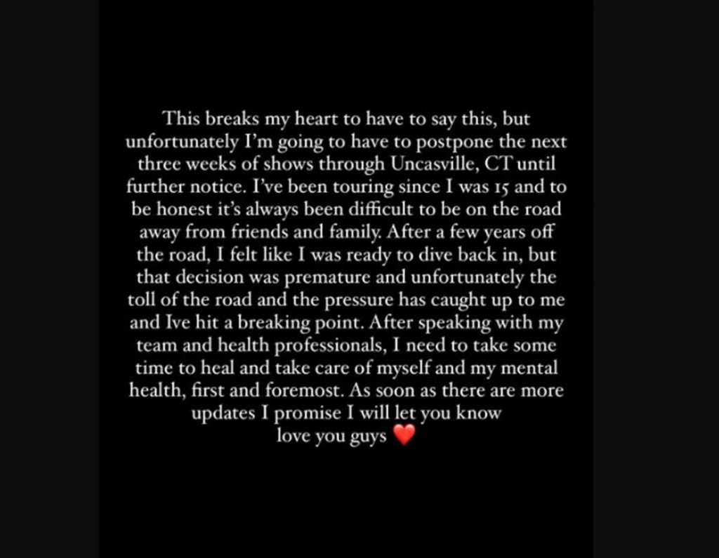 Traducido al español, el texto indica en Instagram: "Me rompe el corazón tener que decir esto, pero desafortunadamente voy a tener que posponer las próximas tres semanas de shows por Uncasville, CT hasta hasta nuevo aviso. He estado de gira desde que tenía 15 años y, para ser honesto siempre, ha sido difícil estar en la carretera lejos de los amigos y la familia. Después de unos años fuera de la carretera, sentí que estaba listo para volver a sumergirme, pero esa decisión fue prematura y, por desgracia, el peaje de la carretera y la presión me han alcanzado y he llegado a un punto de ruptura. Después de hablar con mi equipo y los profesionales de la salud, necesito tomarme un tiempo para sanar y cuidar de mí mismo y de mi salud mental ante todo. Tan pronto como haya más actualizaciones, prometo que se los haré saber. Los quiero, chicos".
