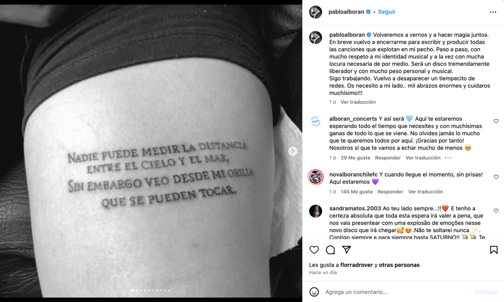 El malagueño acompañó el mensaje con varias fotos en blanco y negro de tatuajes de algunos de sus fans, con letras de sus canciones escritas en ellos. “Nadie puede medir la distancia entre el cielo y el mar…”, se lee en el brazo de un fanático.