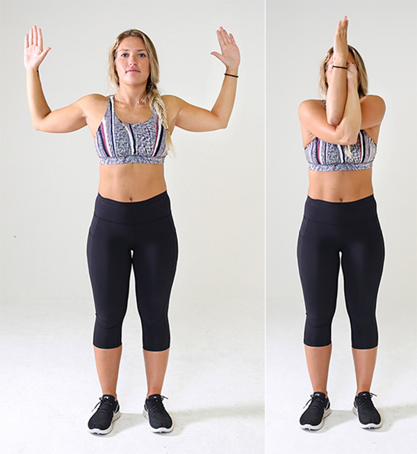 Parte con tus brazos sobre tu cabeza, lleva tu codo hacia el centro de tu cuerpo, pone el codo derecho sobre el izquierdo que apunta hacia la dirección contraría. O sea, el derecho queda sobre el izquierdo.
