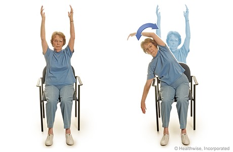 Siéntate derecha y trata de inclinarte hacia tu derecha, con tus dedos de la mano apuntando al suelo. Luego levanta tu brazo izquierdo, lo que te da un estiramiento en tu costado izquierdo.