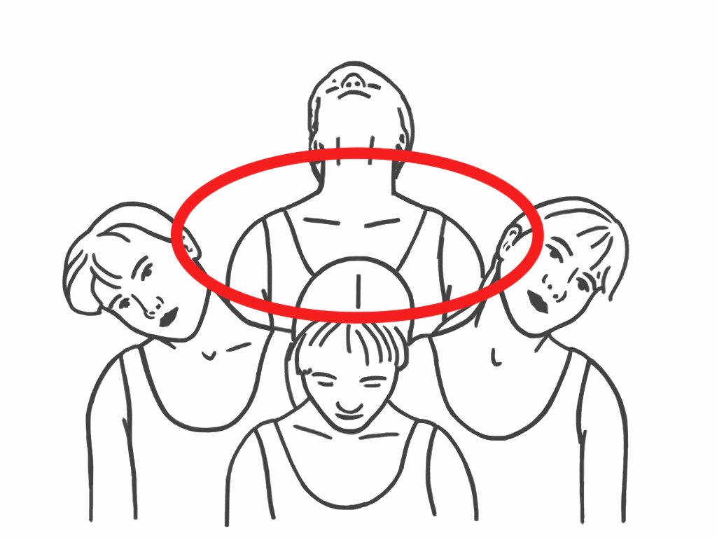 Parte llevando tu barbilla al pecho, luego inclina una oreja hacia el hombro y comienza a dar vuelta tu cuello en esa dirección. Inhala y exhala profundamente y cambia de dirección después de tres respiros.