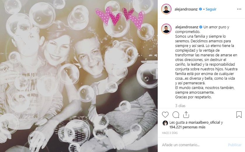 “Somos una familia y siempre lo seremos. Decidimos amarnos para siempre y así será. Lo eterno tiene la complejidad y la ventaja de transformar las maneras de amarse en otras direcciones sin destruir el cariño, la lealtad y la responsabilidad conjunta sobre nuestros hijos”.