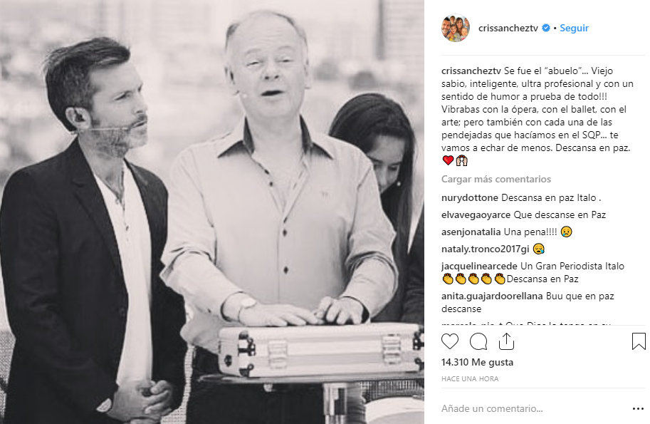 Sánchez, compartió una foto a través de Instagram, donde escribió "Se fue el “abuelo”... Viejo sabio, inteligente, ultra profesional y con un sentido de humor a prueba de todo!!! Vibrabas con la ópera, con el ballet, con el arte; pero también con cada una de las pendejadas que hacíamos en el SQP... te vamos a echar de menos. Descansa en paz."